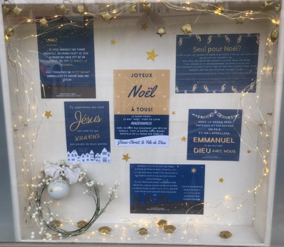 Motivées par les vitrines d’évangélisation proposées par Magali ici, nous avons imaginé une vitrine thématique pour Noël.