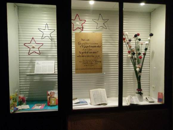 Le top est de donner une certaine cohérence aux différents éléments de la vitrine, même si la déco n’a pas besoin d’illustrer les versets.